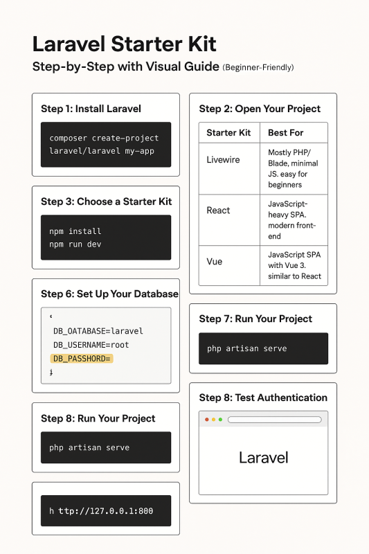 We want to help you start your new Laravel application easily. That’s why we offer starter kits. These kits give you a ready-made structure with routes, controllers, and views. They help you set up user registration and login quickly. The starter kits use Laravel Fortify for authentication.
